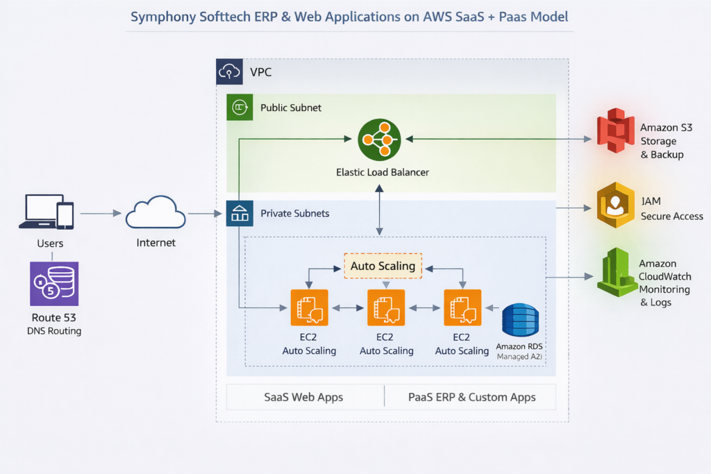 Symphony Softtech modernized delivery of its Sage 300 & Shampan ERP plus customer web apps by hosting on AWS. Using a SaaS/PaaS model (managed database, autoscaling compute, secure VPC, monitoring), it boosted uptime, scale, and lowered ops cost