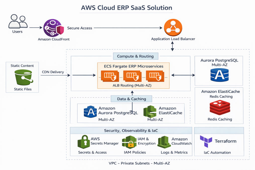 • Amazon ECS on AWS Fargate runs the ERP backend as containerized microservices (no server management).